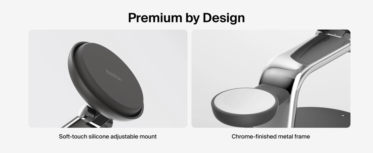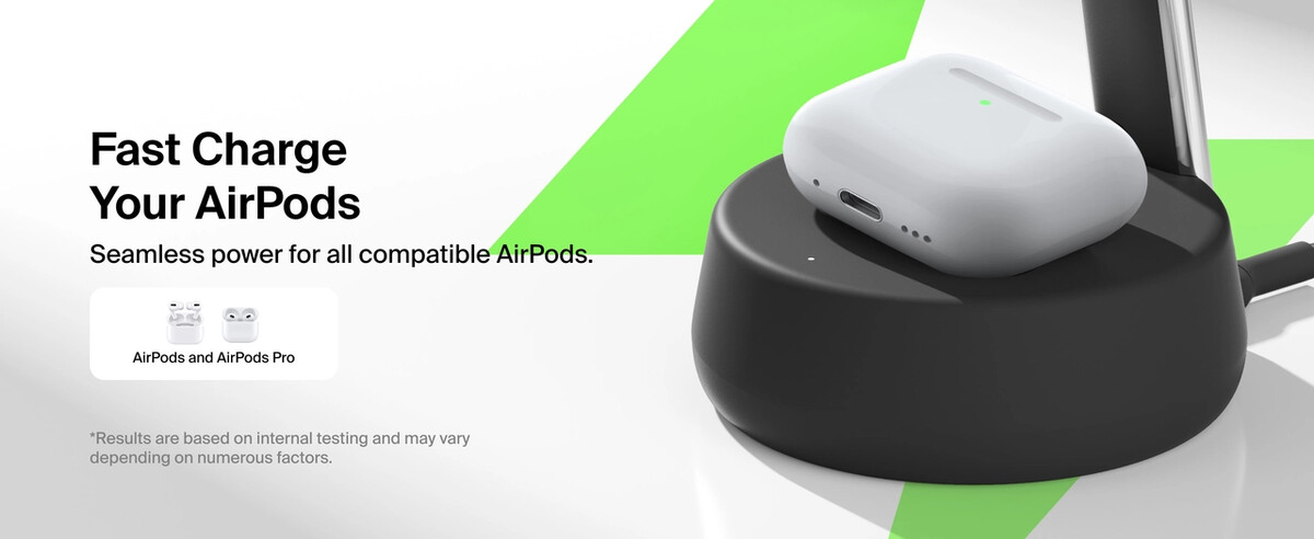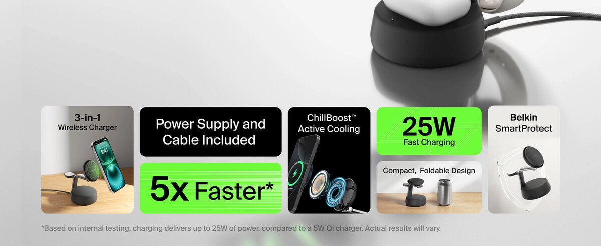 Power your iPhone from 0-50% in just 25 minutes. Featuring ChillBoost active cooling technology, a proprietary technology that regulates device temperature during fast charging.†† Safely fast charge up to three devices (iPhone, Apple Watch and AirPods) simultaneously with Qi2 25W or MagSafe 25W technology.