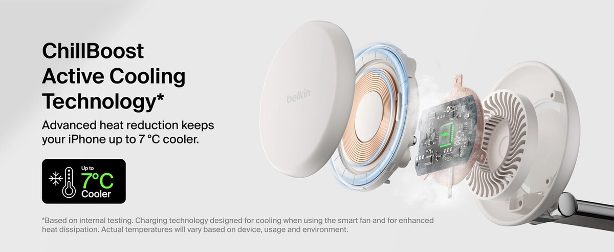 - ChillBoost™ active cooling technology provides temperature regulation, up to 12 degrees Fahrenheit (7 degrees Celsius) cooler, to optimize high-speed wireless charging. Optional quiet internal smart fan features on/off switch.