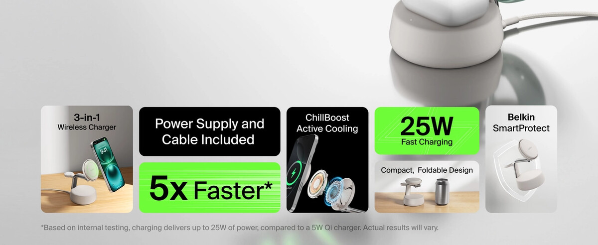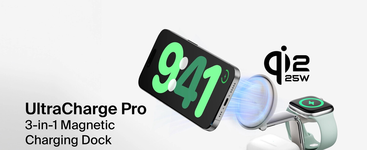 up to three devices (iPhone, Apple Watch and AirPods) simultaneously with Qi2 25W or MagSafe 25W