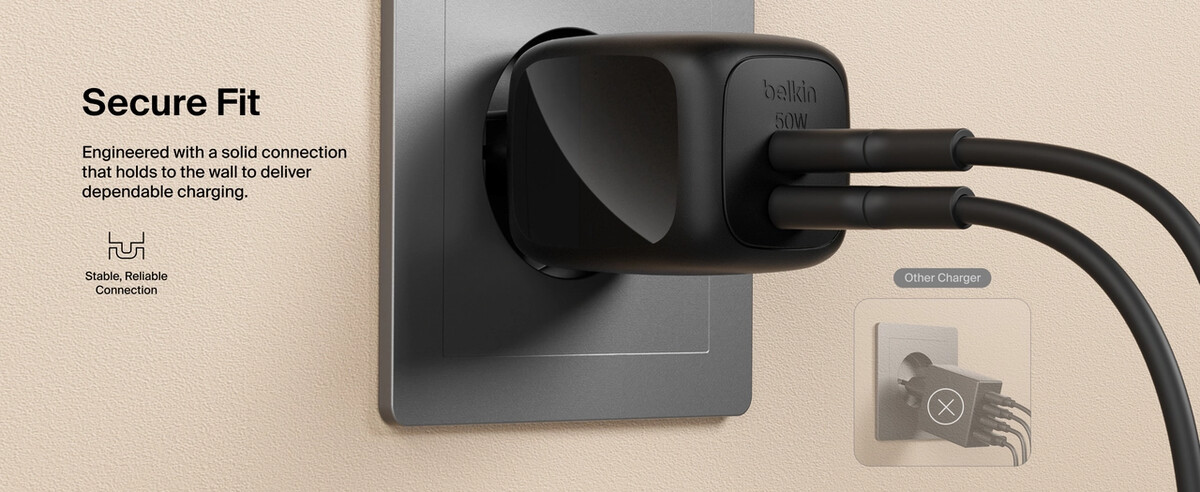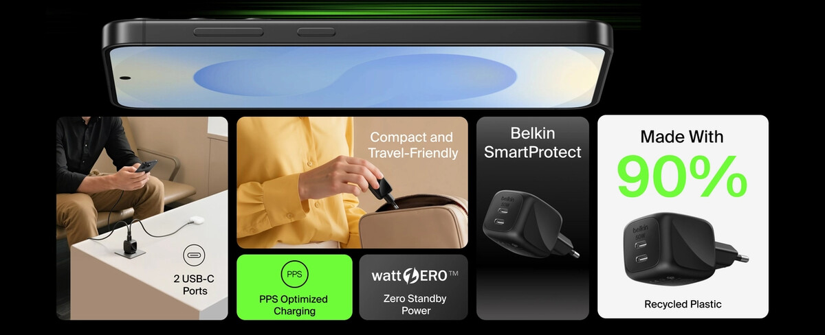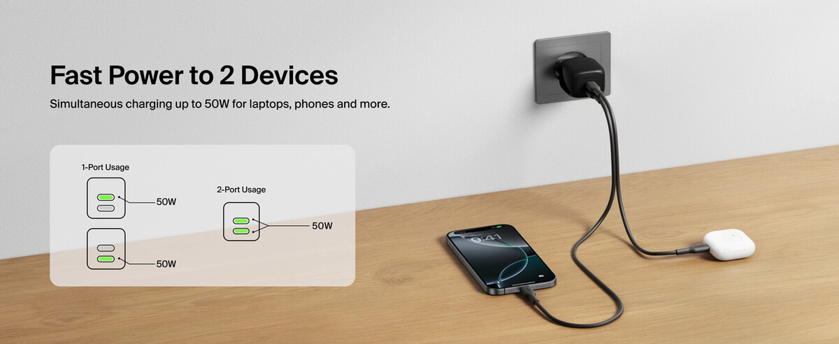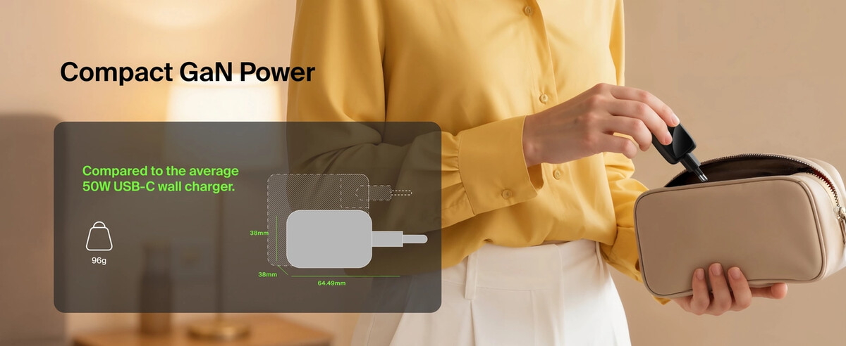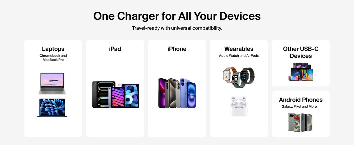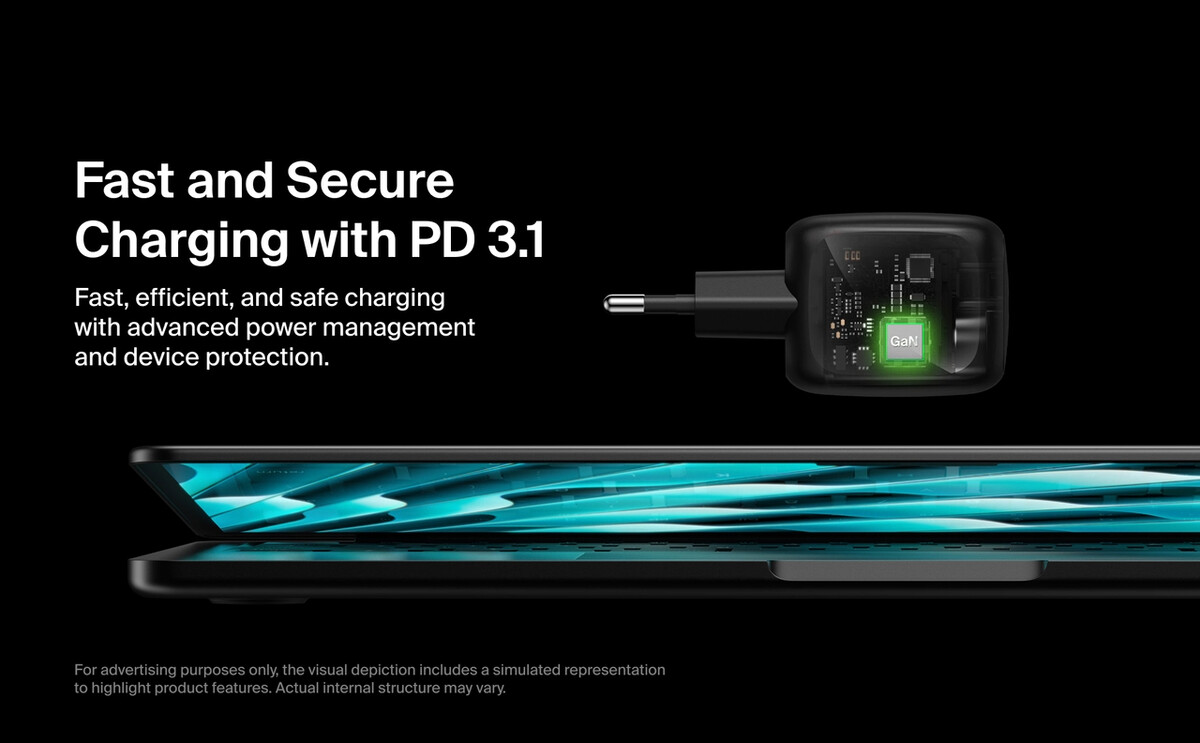 - Quickly charge your devices with GaN — an iPhone 16 Pro from 0 to 50% in 27 minutes and a Samsung S25 Ultra in 28 minutes; also suitable for Chromebook, iPad Air 13 and MacBook Air 13
