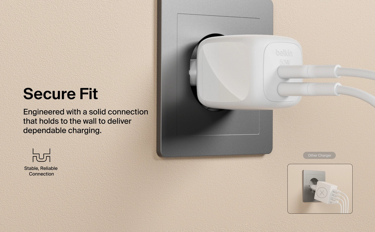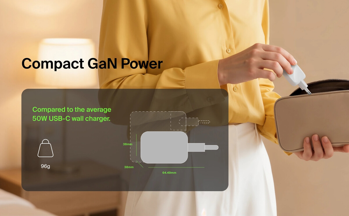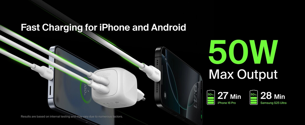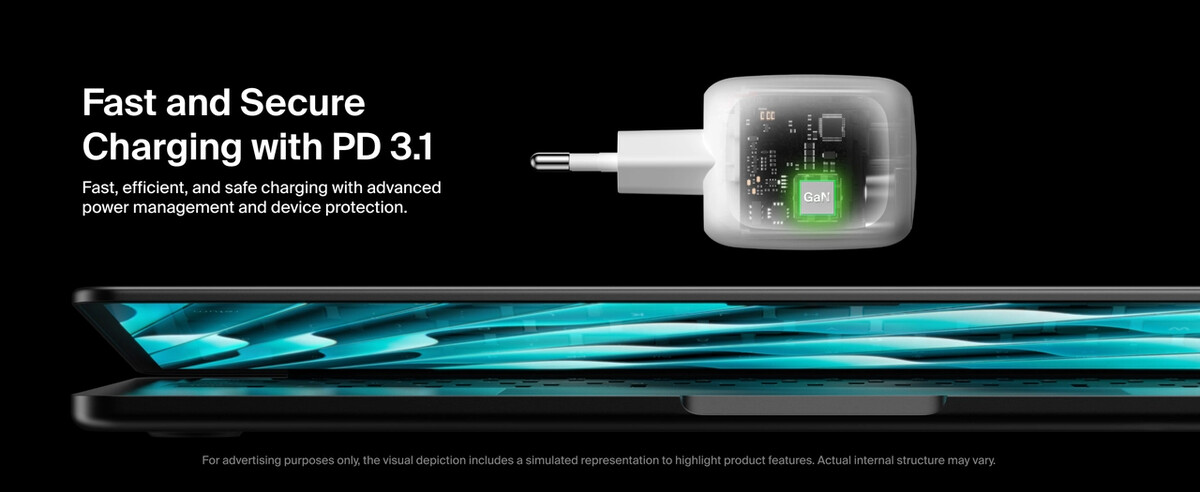 - Quickly charge your devices with GaN — an iPhone 16 Pro from 0 to 50% in 27 minutes and a Samsung S25 Ultra in 28 minutes; also suitable for Chromebook, iPad Air 13 and MacBook Air 13