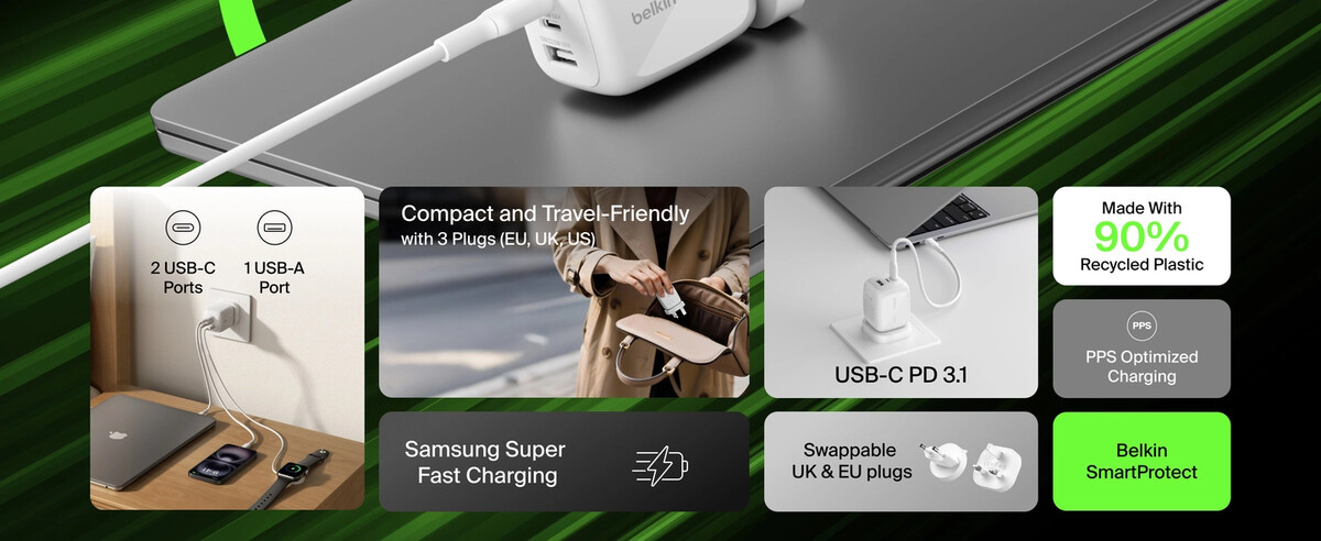 - Enjoy on-the-go charging with dual USB-C and single USB-A ports