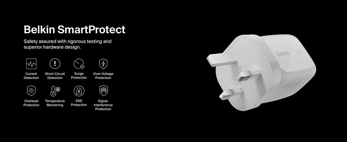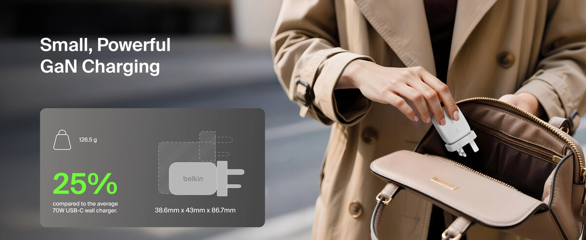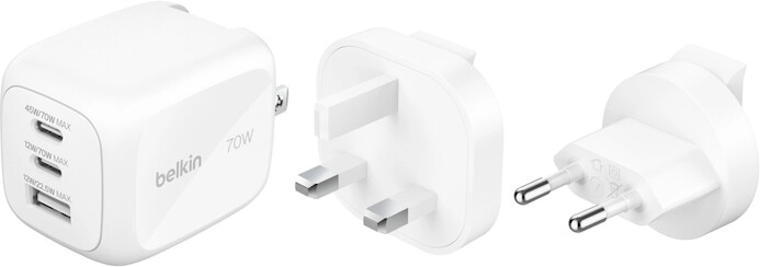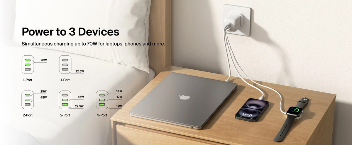 Speed and efficiency team up in this compact, portable GaN-powered wall charger. Professionals and travelers will appreciate its 70W of power plus the ability to charge 3 devices at once. Power your wanderlust with one charger for your phone, laptop, earbuds, Apple Watch and tablet.