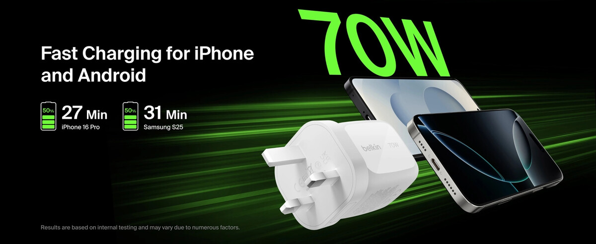 - Fast Charge your iPhone 16 Pro from 0-50% in 27 minutes, Samsung S25 from 0-50% in 26 mins†; Chromebook, iPad Air 13 and MacBook Air 13