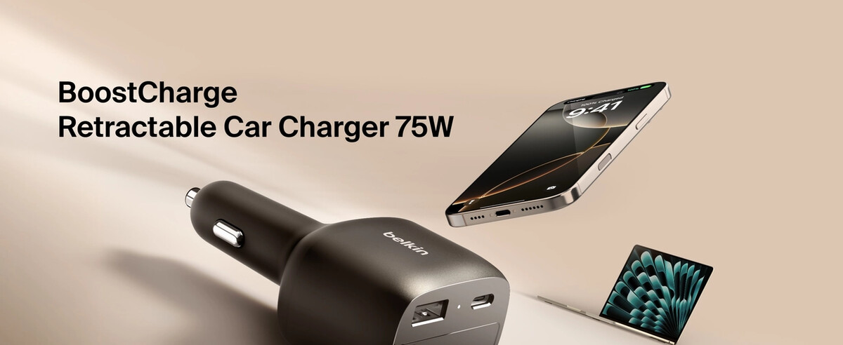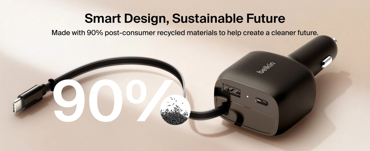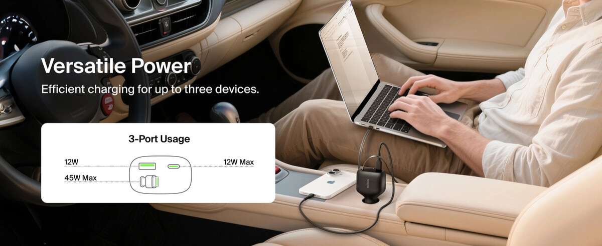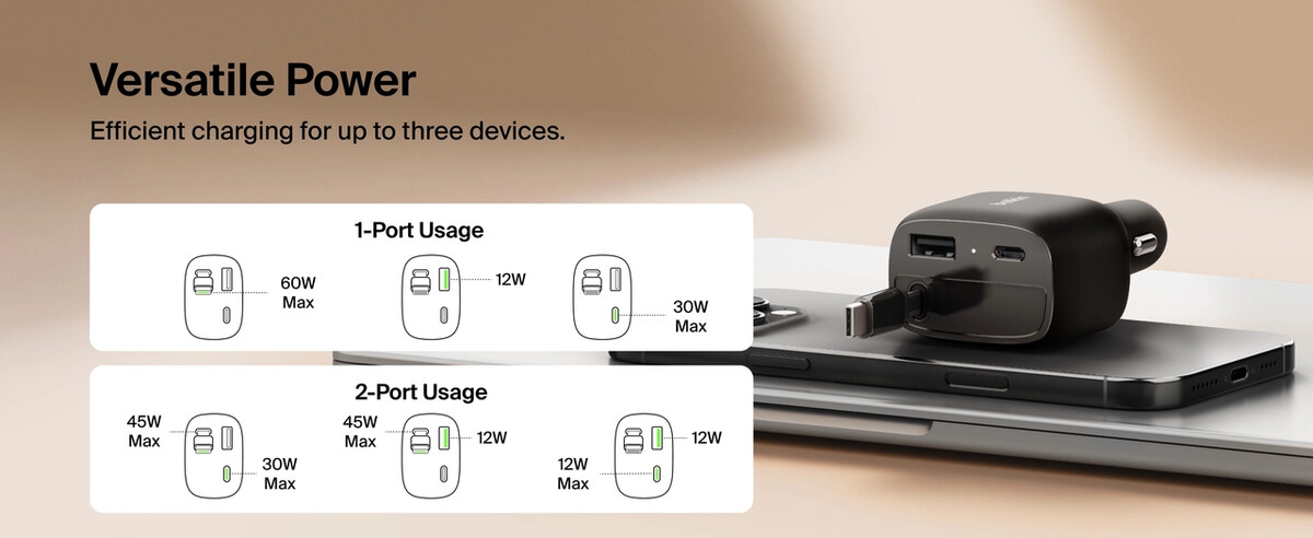 This car charger has two ports (USB-C + USB-A) plus a retractable USB-C cable, making it a game changer when you’re in your car. Its tangle-free 75cm cable supports 60W maximum output and charges most laptops in the market. Imagine fast charging three things at once — your iPhone or Samsung Galaxy and two other USB-C powered devices. Dynamically distributed power ensures you get the maximum power out of this car charger, no matter what you choose to plug in.