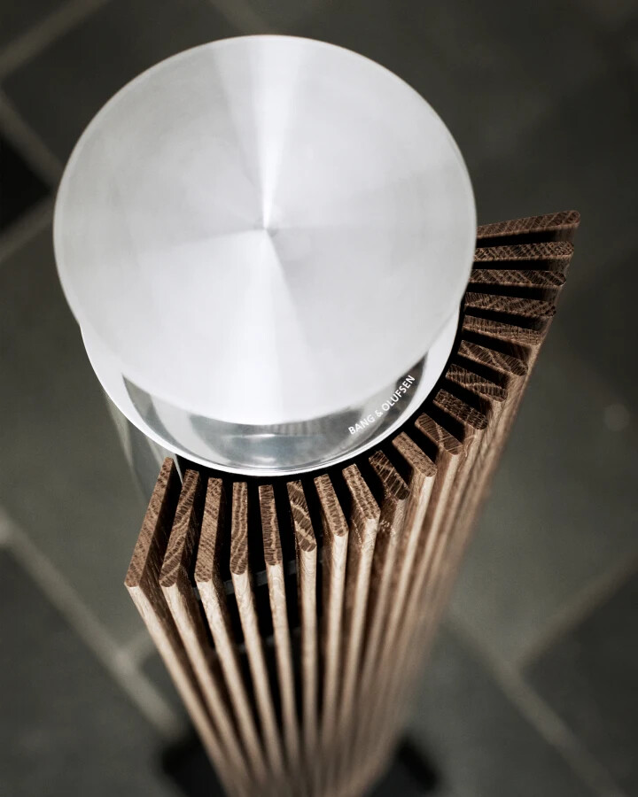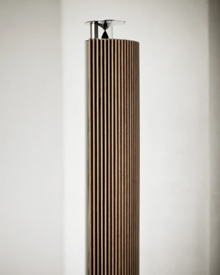 Алюминиевая колонна почти волшебным образом балансирует на своем заостренном основании, в то время как искусно изготовленные деревянные ламели распределяют звук веером по всей комнате в сочетании с акустической линзой вверху. Совершенная гармония дизайна и технологий.