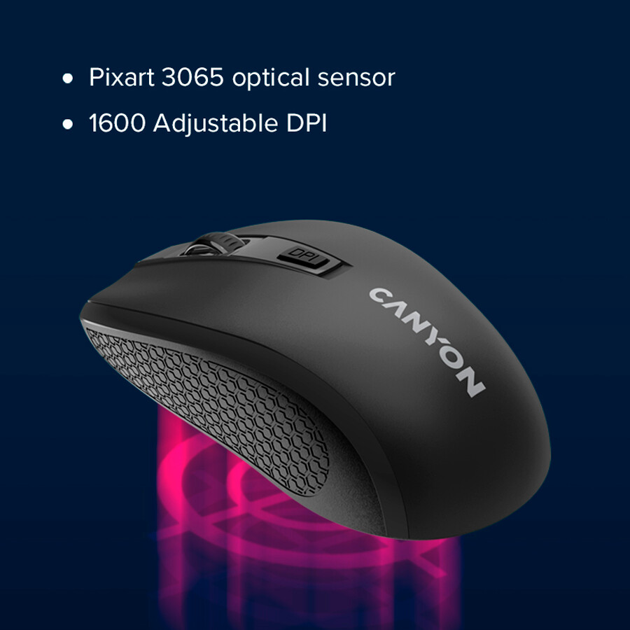This Canyon wireless mouse is a precise and durable solution for your business or creative needs. Forget about misclicks – the Pixart 3065 optical sensor is adjustable and reaches 1600 DPI. Connected via a 2.4GHz USB receiver, the mouse is powered by one standard AA battery. It is plug-and-play, so just pick your preferred resolution and get things done! And leave all the worries behind because we took care of reliability: all 4 buttons will serve you for 3 million clicks. Get a dependable tool for your tasks now!