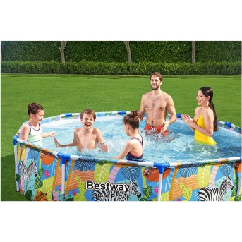 Каркасный бассейн Steel Pro 305 х 66см, BESTWAY, 56985, Винил, 4062 л., Стальной каркас, Цветная графика, Цветная коробка Каркасный бассейн Bestway отличается высокой прочностью и устойчивостью. Чаша выполнена из высококачественного трехслойного ПВХ: два слоя плотного винила и один - стекловолокно для особой прочности. Каркас металлический нержавеющий оцинкованный. Не требует бетонирования и подготовки ямы, все, что нужно, это плоская, горизонтальная площадка. Сезонный бассейн (рекомендуется разбирать на холодное время года) обладает простой конструкцией - может быть легко разобран и собран заново. Время сборки и подключения бассейна не более 30-40 минут. Удобный сливной клапан позволяет присоединить садовый шланг, что дает возможность слить воду в любое место. Материал чаши: высококачественный трехслойный винил; Материал каркаса: оцинкованные стальные трубы с порошковой окраской (снаружи и внутри); Диаметр: 305 см Высота: 66 см Объём бассейна: 4062 л. Тип подключения аксессуаров: на хомутах; Время монтажа: 30-40 минут + наполнение водой. Комплектация Клапан для слива воды - есть; Ремкомплект.