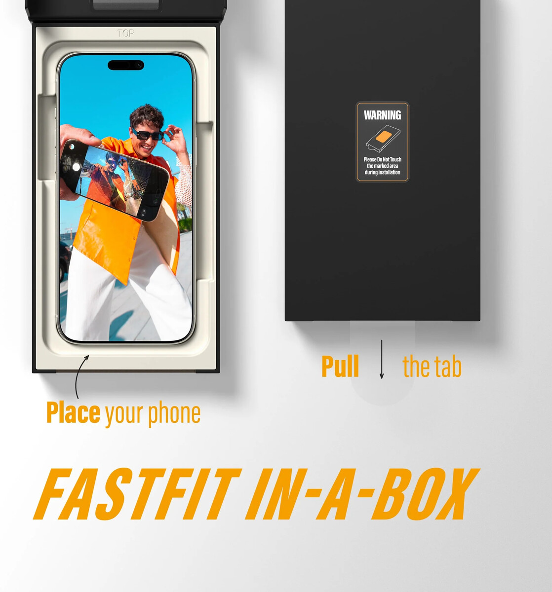 Installation has never been easier with the new FASTFIT IN-A-BOX system. Say goodbye to alignment issues and dust intrusion. Simply place your phone face-up, pull the tab, and enjoy a flawless installation every time.