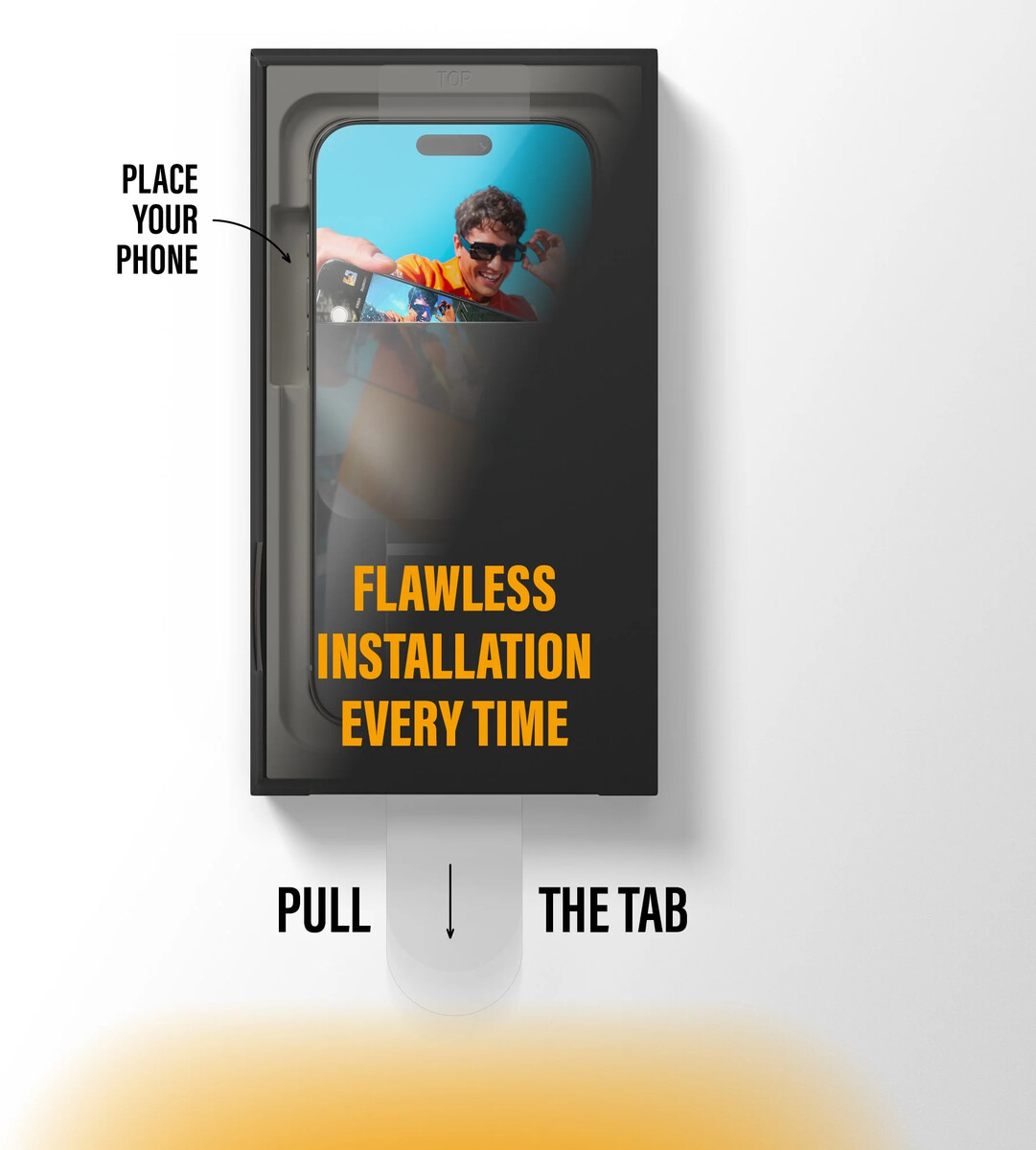 Installation has never been easier with the new FASTFIT IN-A-BOX system. Say goodbye to alignment issues and dust intrusion. Simply place your phone face-up, pull the tab, and enjoy a flawless installation every time.