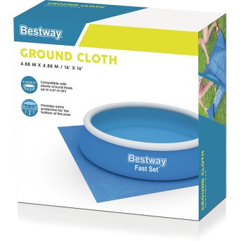 Подложка для бассейна 488 х 488 см, BESTWAY, 58003, Винил, Для бассейнов диаметром до 457 см, Синий, Цветная коробка Предназначена для защиты дна бассейна от проколов и протирания под воздействием давления воды. Служит декоративным элементом. Практична в эксплуатации. Увеличивает срок службы бассейна. Защищает дно от выбоин и трещин, от повреждений о мелкие камни и другой мусор. Замедляет износ и истончение чаши. Уменьшает засорение воды и дна бассейна. Сохраняет ноги чистыми. Купальщики будут с удовольствием ходить босиком по чистой, приятной на ощупь поверхности. Упрощает подготовку территории. Перед установкой бассейна уберите с земли сучки, камни, выровняйте грунт и постелите подстилку. Осенью Вам не придётся отмывать дно бассейна от грязи. Оставляет землю чистой. Задерживает воду, которая выплескивается из бассейна. Долговечна. Изготовлена из высококачественного многослойного полиэтилена. Размер подложки: 488 х 488 см Время уставновки: до 5 минут; Материал: тарпаулин 0,25 мм- полиэтиленовые ленты плотного переплетения с ламинирующим распылением, края изделия запаяны; Другие особенности: высокая прочность, устойчивый к растяжкам, мобильность, легкость, 100% гидроизоляция (вода, грязь), устойчивый к УФ.