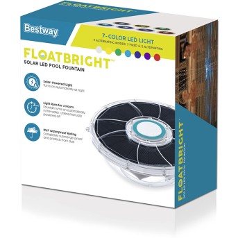 LED-подсветка с фонтаном плавающая для бассейна FloatBright, Bestway, 58849, Пластик, 7 цветов подсветки, На солнечных батареях, Для каркасных бассейнов, Белый Плавающий фонтан для бассейна с питанием от солнечных батарей Bestway® FloatBright™ добавит изюминку и роскошь вашему вечернему отдыху в бассейне! Плавающий фонтан для бассейна имеет подсветку с питанием от солнечных батарей, которая автоматически включается ночью, а сам фонтан может распылять воду на высоту до 50 см (19,5 дюйма). Благодаря передовой светодиодной технологии этот 7-цветный светильник для бассейна можно использовать внутри или снаружи бассейна. Световое пятно имеет диаметр до 2,44 м (8 футов) и распространяется на 1,52 м (5 футов) в глубину бассейна. Выберите один из 9 чередующихся режимов: 7 фиксированных и 2 чередующихся, и погрузитесь в красочную атмосферу темным вечером. Светодиодный фонтан с питанием от солнечных батарей для бассейна Bestway FloatBright полностью водонепроницаем при погружении благодаря классу защиты IP67, который обеспечивает и защиту от вредной пыли, поэтому им можно наслаждаться на улице в течение многих сезонов. Фонтан для бассейна включается с помощью кнопки ВКЛ/ВЫКЛ одним касанием и экономит заряд батареи благодаря автоматическому отключению, которое активируется через час. Светодиодный фонтан с питанием от солнечных батарей для бассейна Bestway FlowBright непременно подарит вам незабываемое, веселое световое и водное шоу на открытом воздухе. 7-цветная светодиодная подсветка (9 чередующихся режимов: 7 фиксированных и 2 с чередованием цветов) Фонтан автоматически включается в воде, если его не отключить вручную Лампа с питанием от солнечной батареи включается автоматически ночью Заряжается за 5-10 часов, работает 3 часа за раз Кнопки ВКЛ./ВЫКЛ. для управления одним нажатием Фонтан и верхнее освещение с автоматическим выключением через 1 час Водонепроницаемость по классу IP67 – полная водонепроницаемость при погружении и защита от пыли Фонтанные струи высотой до 50 см (19,5 дюйма) Световое пятно имеет диаметр до 2,44 м (8 футов) и распространяется на 1,52 м (5 футов) в глубину В комплект входит: 1 фонтан для бассейна