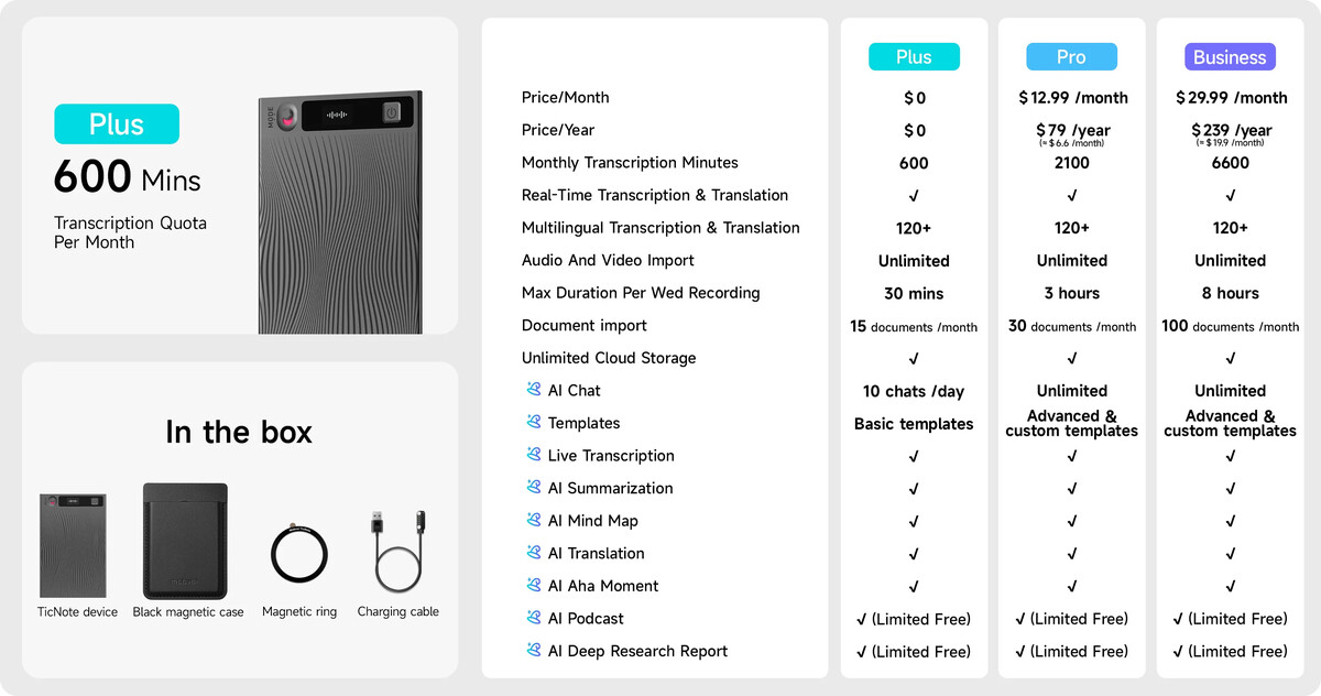 TicNote fits seamlessly into everyday workflows — from recording meetings and client calls to capturing lectures, interviews, brainstorming sessions and on-the-go ideas.