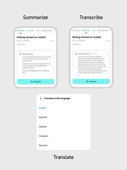 Transcribe and summarize in real time — or translate into 120+ languages instantly